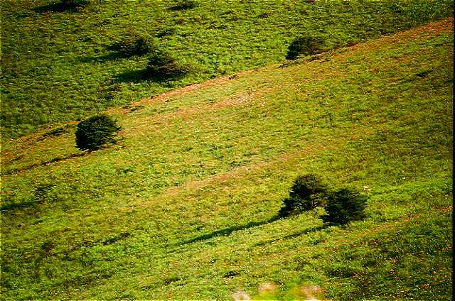 ゆっくりと花を眺めた後、戻り道で東側の斜面をよく見ると、こちらはかなり多量のニッコウキスゲが咲いていた。斜めからブッシュにあたる朝日がおもしろい。(82KB)8:00過ぎには車に戻り、帰宅の途に着いたが、途中後5m下がれば駐車場があるにもかかわらず路上に駐車している車等がたくさん見られた。そのことごとくが50台か60台と思われる熟年の人間であったことが悲しい。これで、今の若者はどうたらこうたらとよく言えるものだ。